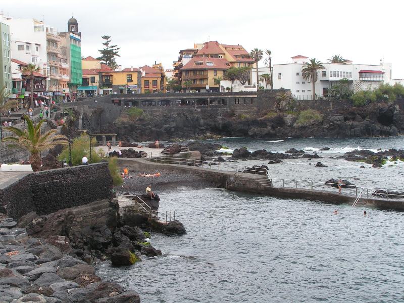 Bu arada belirteyim, adanin kuzeyi ile güneyi arasinda ilkim ve dogal bitki örtüsü cok farklı. Bunun sebebi adanin ortasindaki, 3718 metre ile Ispanya‘nin en yüksek dagi sayilan volkanik Teide dagi. Adanın ortasında sipsivri yükselen bu dagin kuzeyinde genellikle bulutlar takilip kaliyor, dolayisiyla kuzey bölgeleri cok yesil, yagmur aliyor ve cok sıcak degil, fazla plaj yok ama çok ilginç bir plaj var, ulasimi biraz zor ama mutlaka gidilmeli. Playa de el Bolullo, siyah kumlu ve Puerto de la Cruz kasabasinin hemen 2-3 km dogusunda, etrafi muz bahceleri ile cevrilmis. Bu paji mutlaka ziyaret etmelisiniz.. Aslinda kuzeyde kalan tatilcilerin cogu doga yürüyüscüsü ve buraya yürüyerek gidiyorlar (dikkat kuzeyde, aralarda derin vadiler var, yollar biraz dolambacli!). Biz bu plaja araba ile gittik, en ucta park yeri var, 3.-€ yollar da cok dar.